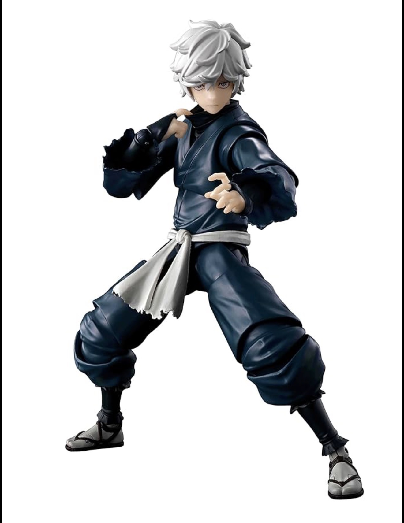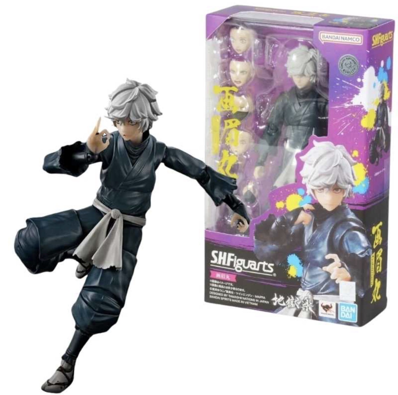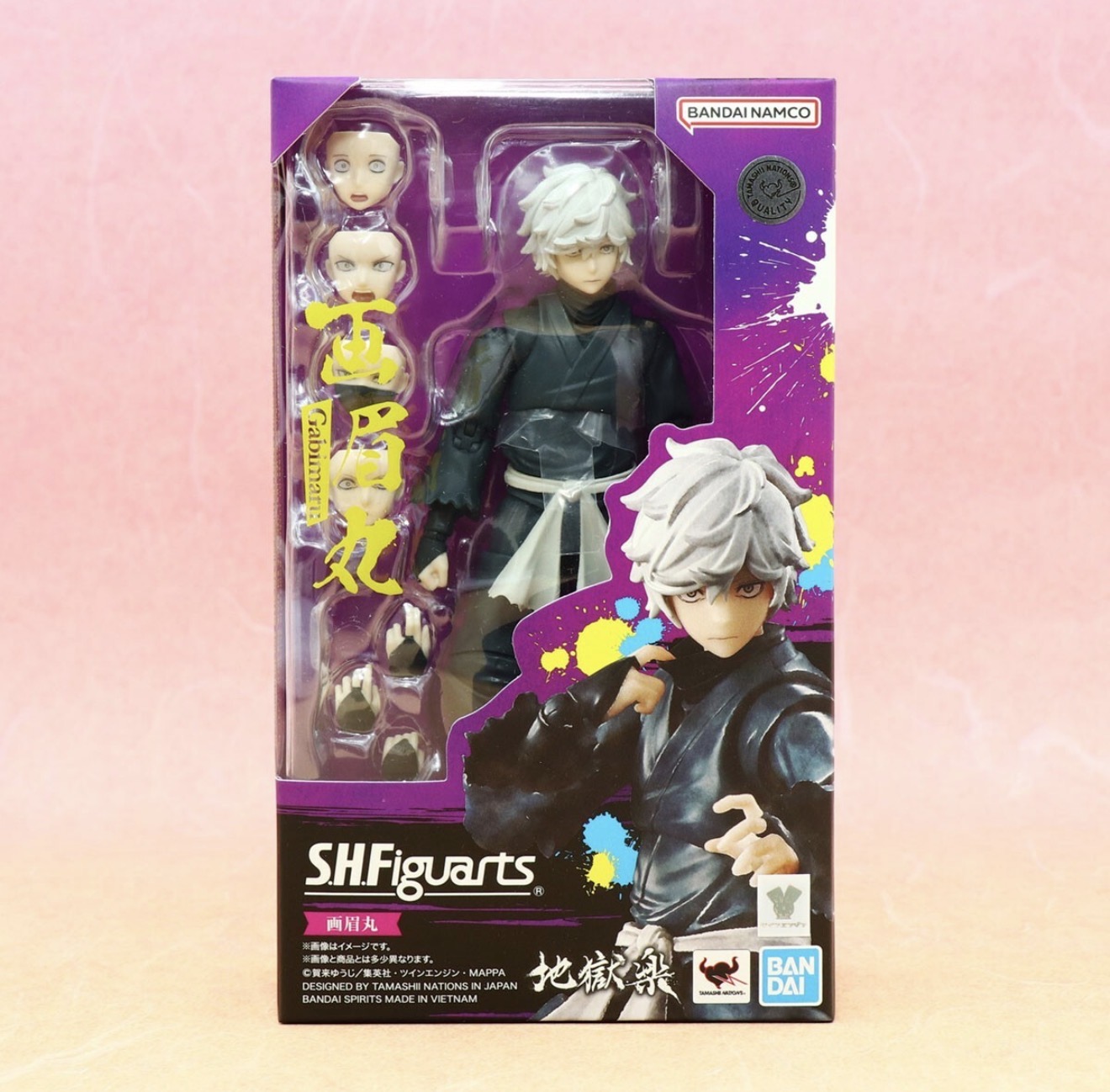 S.H.Figuarts Gabimaru action figure from the anime series Hell's Paradise: Jigokuraku. This posable action figure is approximately 14 cm (about 6 inches) tall. It comes with several accessories, including four interchangeable facial expressions, multiple interchangeable hands, a sword, and optional neck and collar parts. The figure is designed with high articulation to replicate the character's dynamic fighting style from the series. The product is an officially licensed Bandai Spirits product from Bandai Namco.