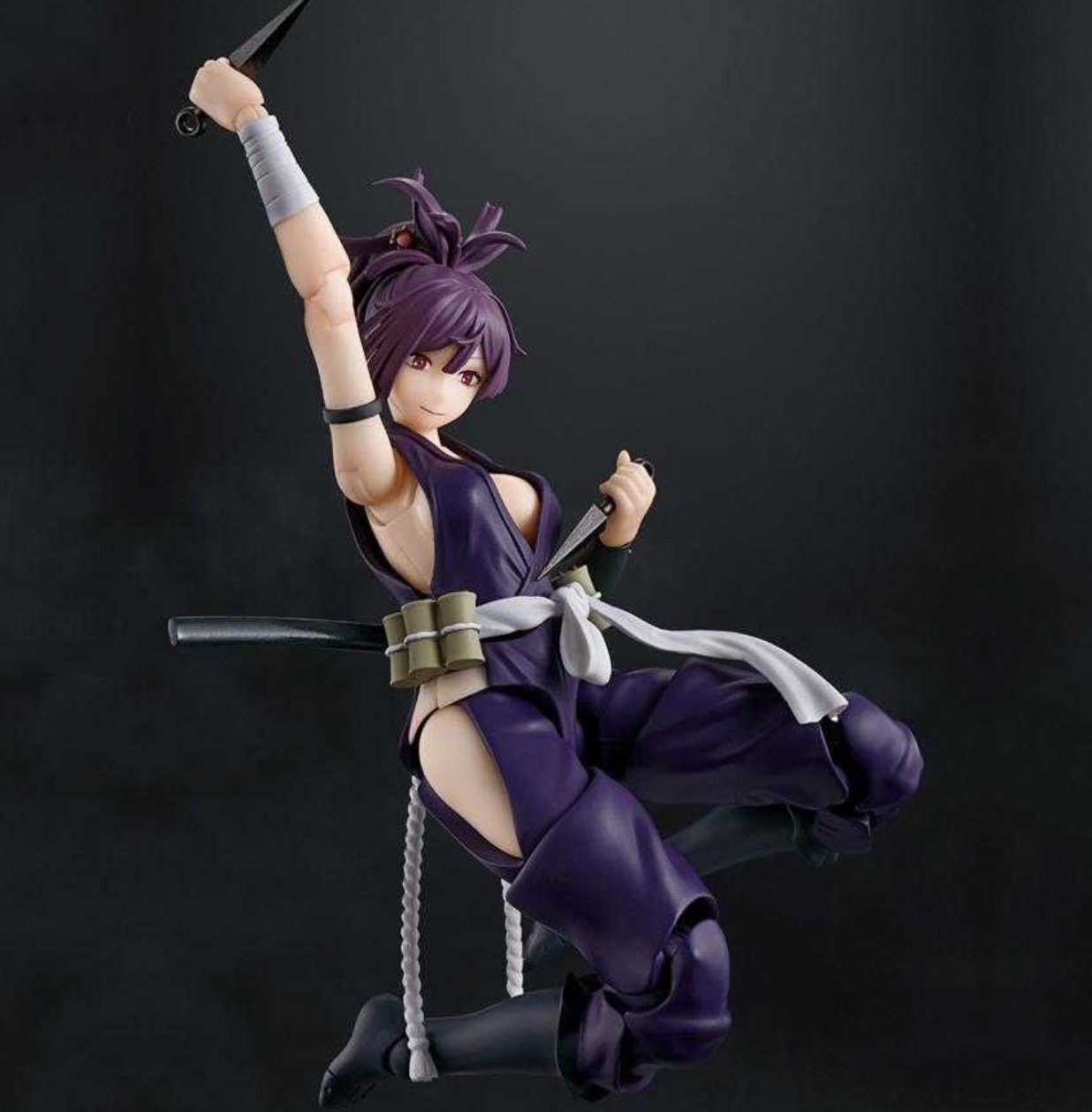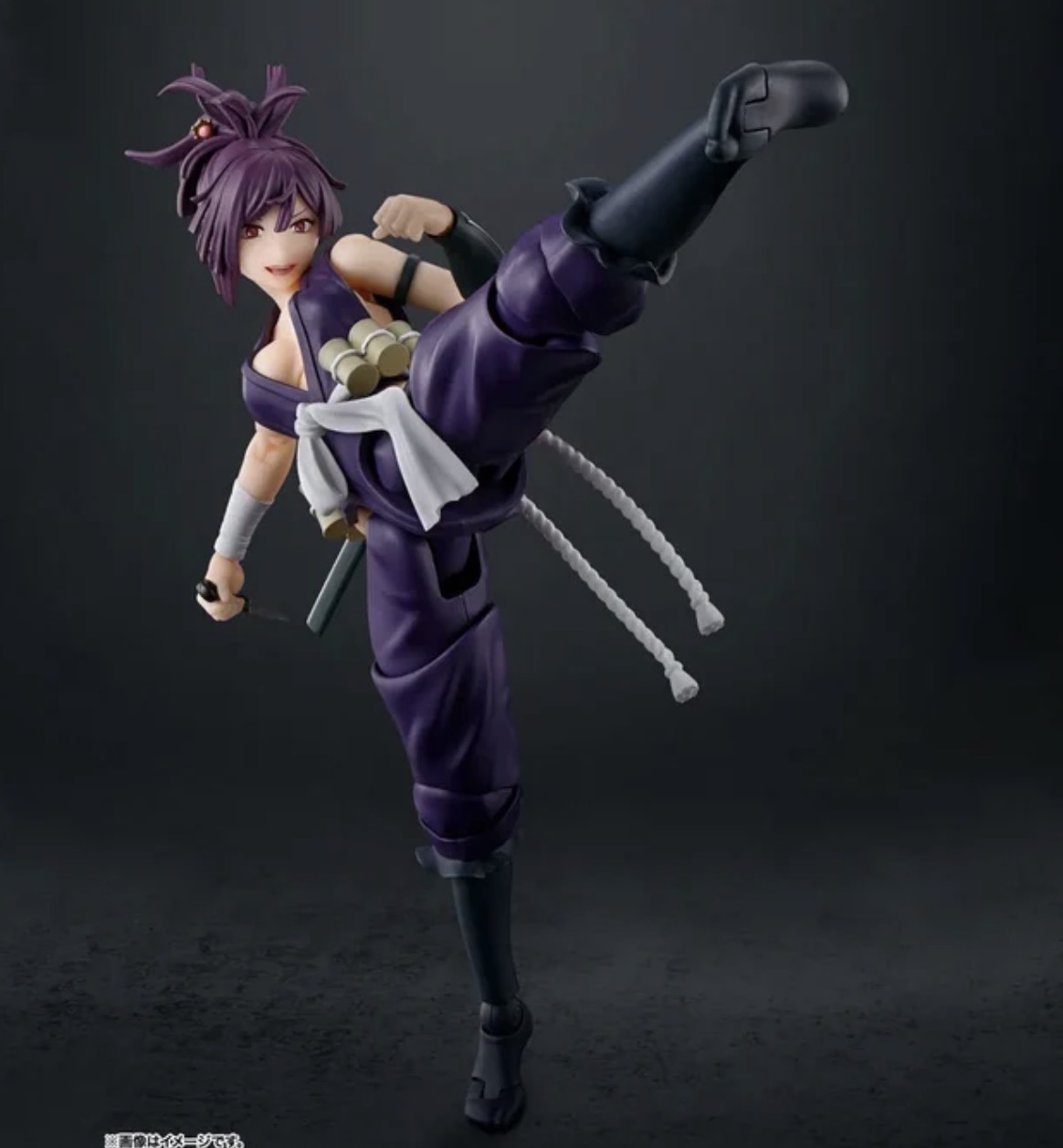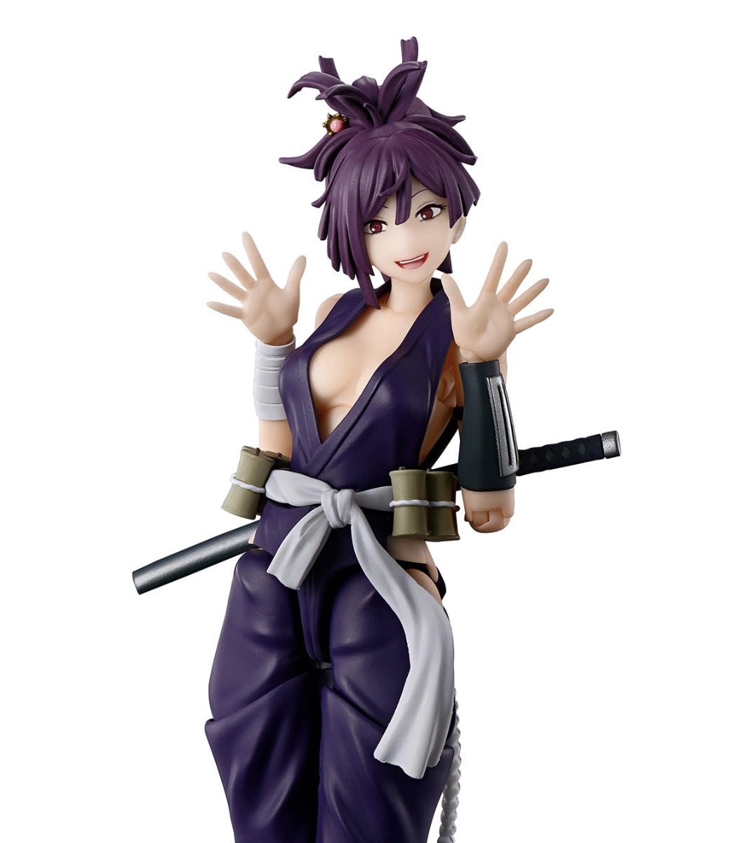 Bandai S.H. Figuarts Yuzurihaaction figure from the anime series Hell's Paradise: Jigokuraku. This fully articulated figure stands approximately 14.5 cm (5.7 inches) tall. It is made from PVC and ABS materials. The set includes the main figure, four optional facial expressions, three pairs of alternative hands, and two kunai blades. The figure is part of the S.H. Figuarts line, known for combining advanced modeling techniques with high articulation to create realistic character renditions. It is an officially licensed Bandai Spirits product.
