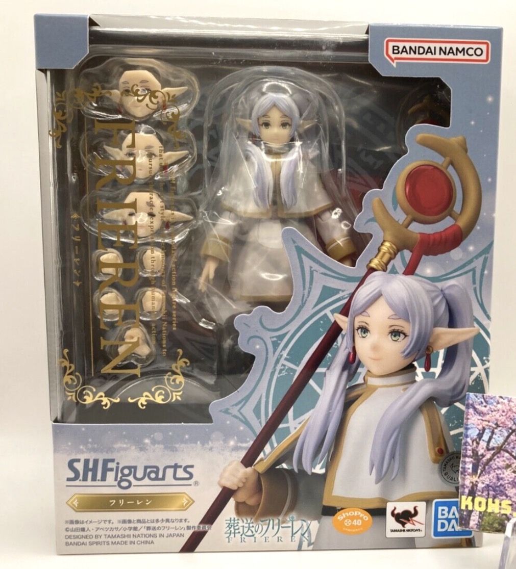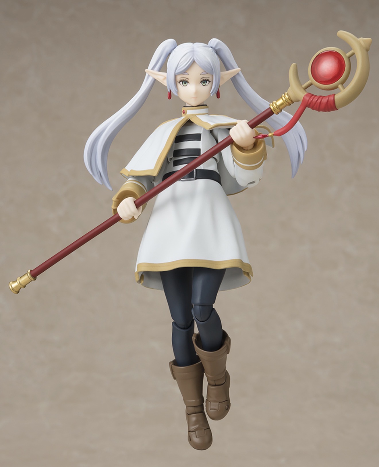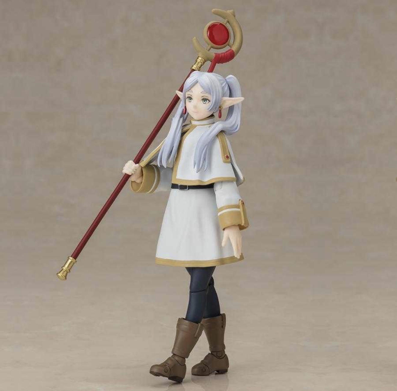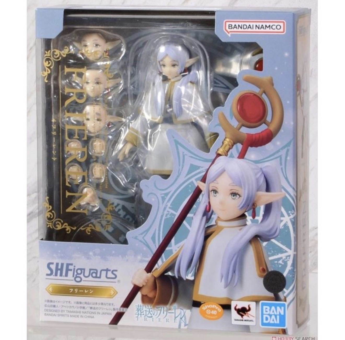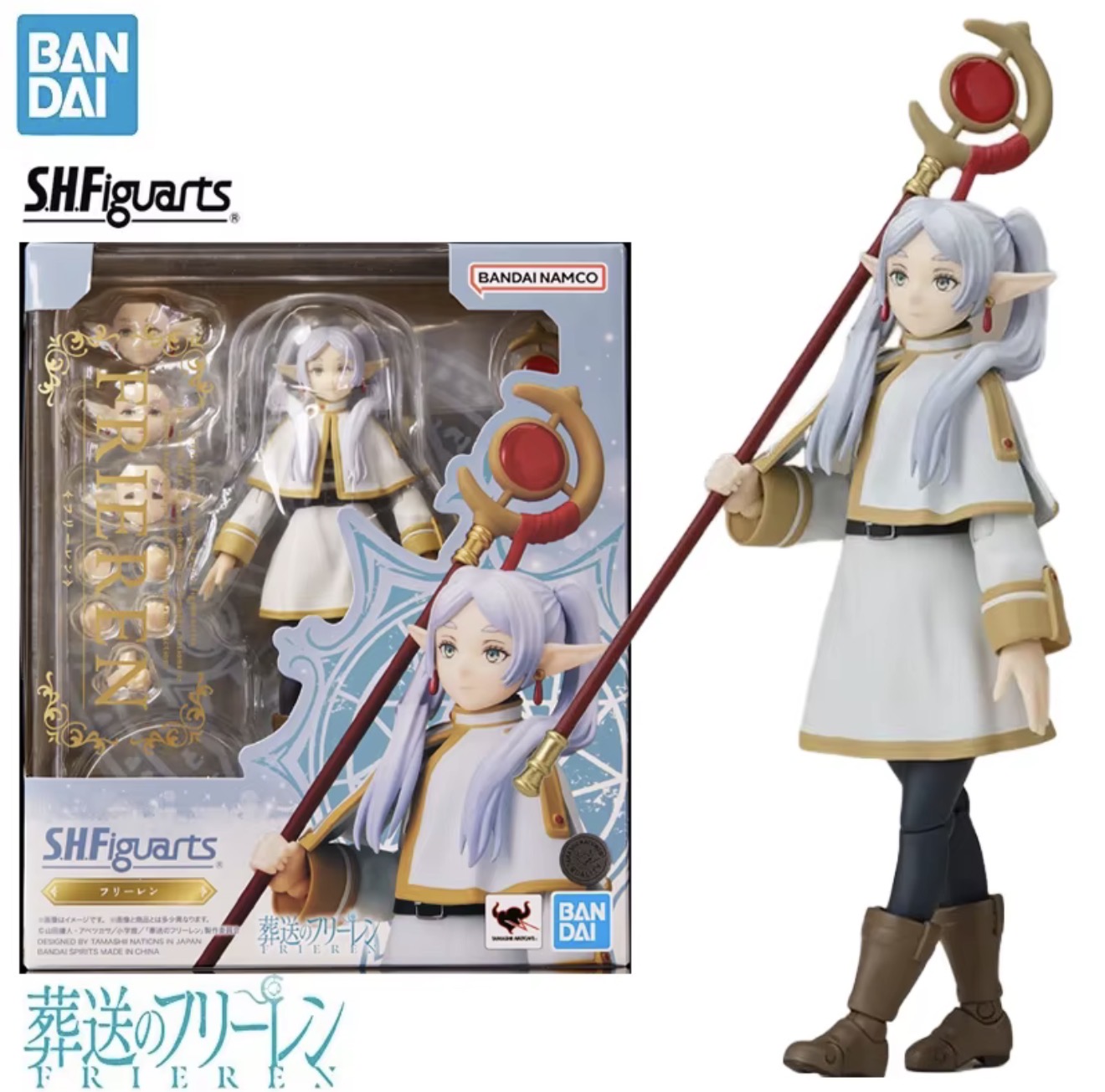 S.H.Figuarts Frieren action figure from the anime and manga series Frieren: Beyond Journey's End.This figure is produced by Bandai Namco under the Tamashii Nations brand. It is an articulated figure, approximately 140 mm (5.5") tall, made from ABS and PVC materials. The set includes multiple accessories such as three interchangeable expression parts, several hand options, a staff, and magic effect parts. The figure is designed to allow for a wide range of dynamic and realistic posing to recreate scenes from the series.