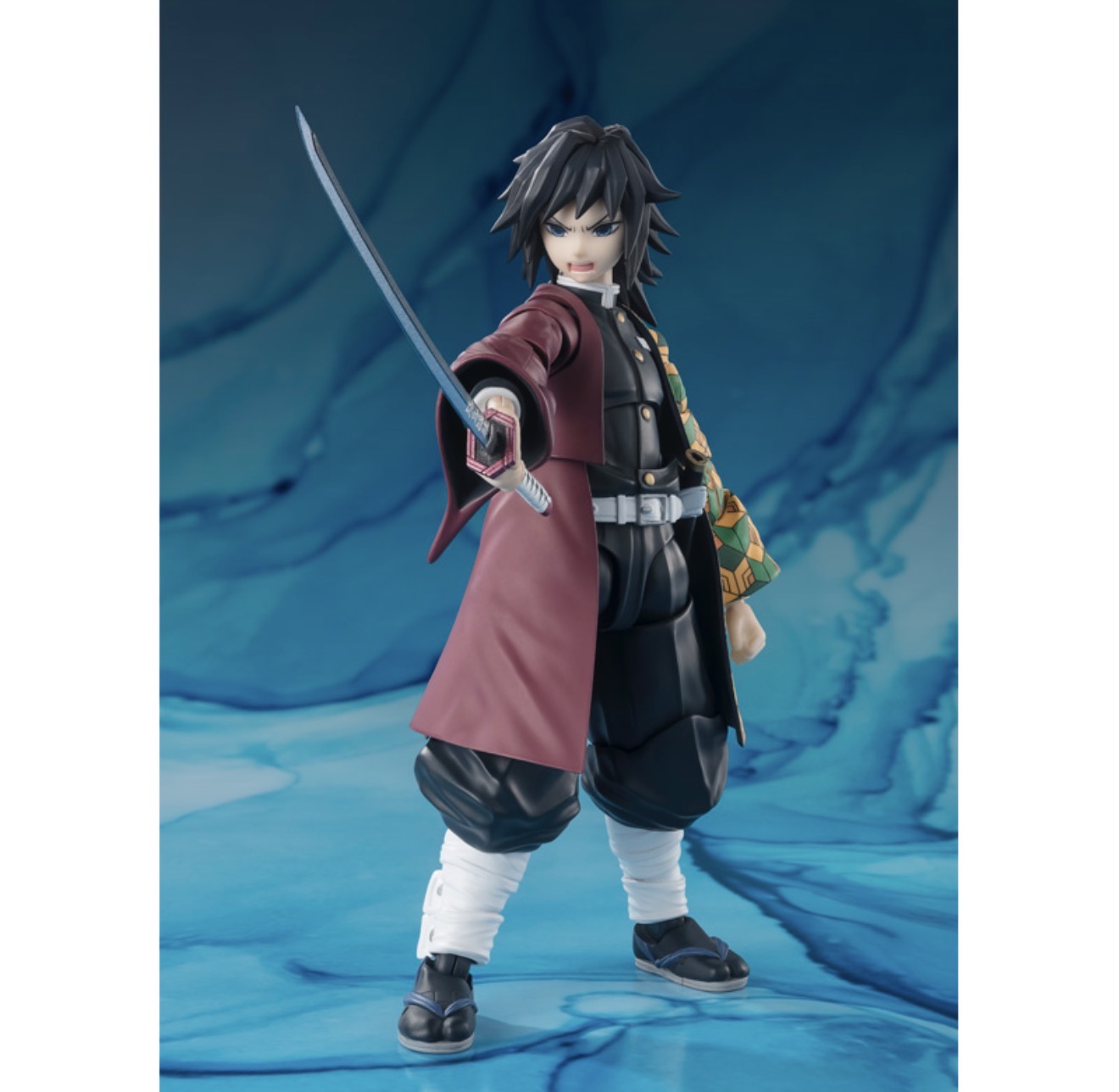 S.H.Figuarts Giyu Tomioka action figure from the anime series Demon Slayer: Kimetsu no Yaiba.Manufacturer: The figure is produced by Bandai Namco's Tamashii Nations line. Material and Size: It is made of ABS and PVC materials and stands approximately 5.9 inches (15 cm) tall. Articulation: The S.H.Figuarts series is known for its wide range of motion, allowing for the recreation of dynamic action poses from the series. Accessories: The figure typically comes with various interchangeable parts, including different face plates, hands, and a Nichirin Sword.