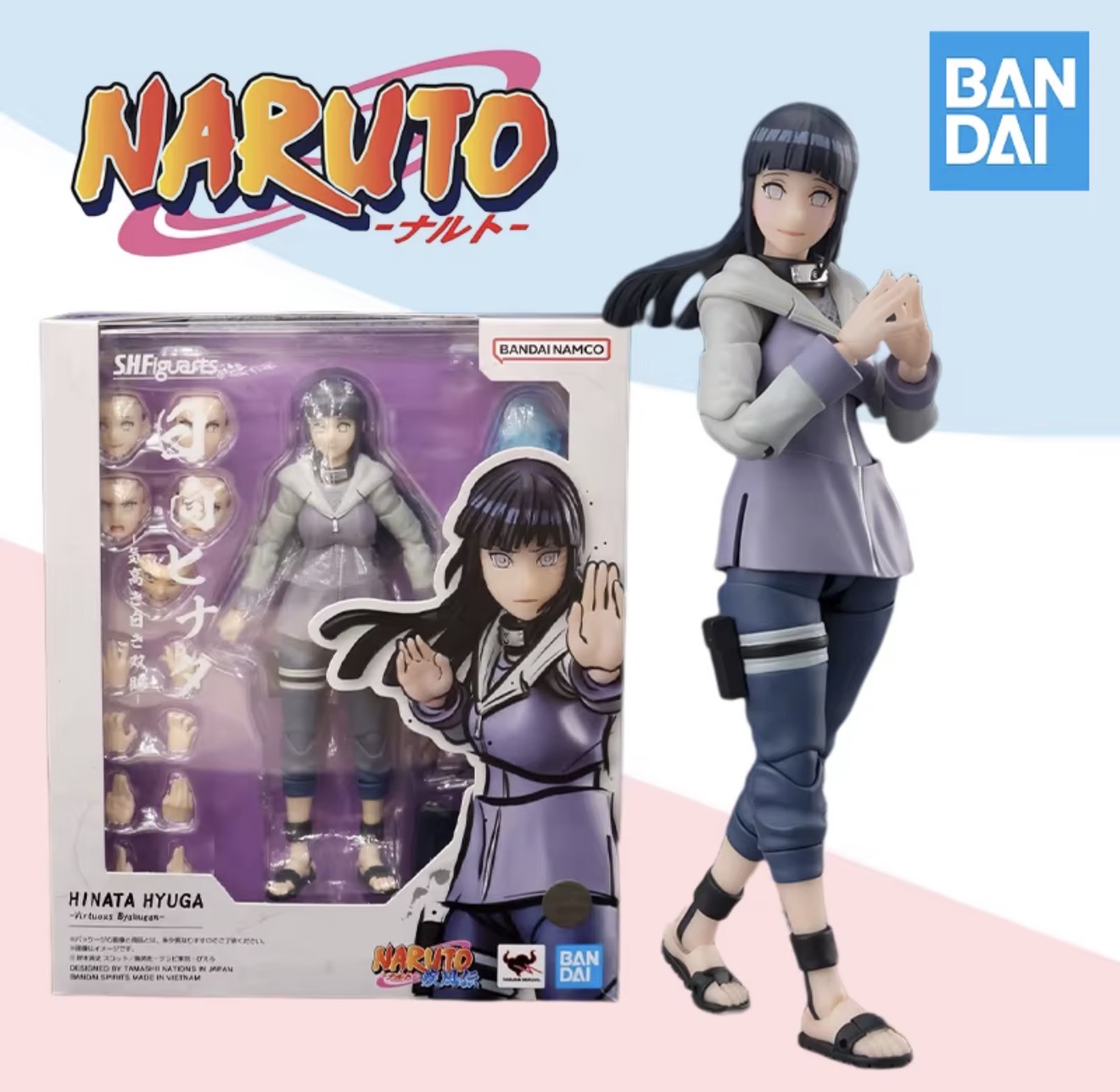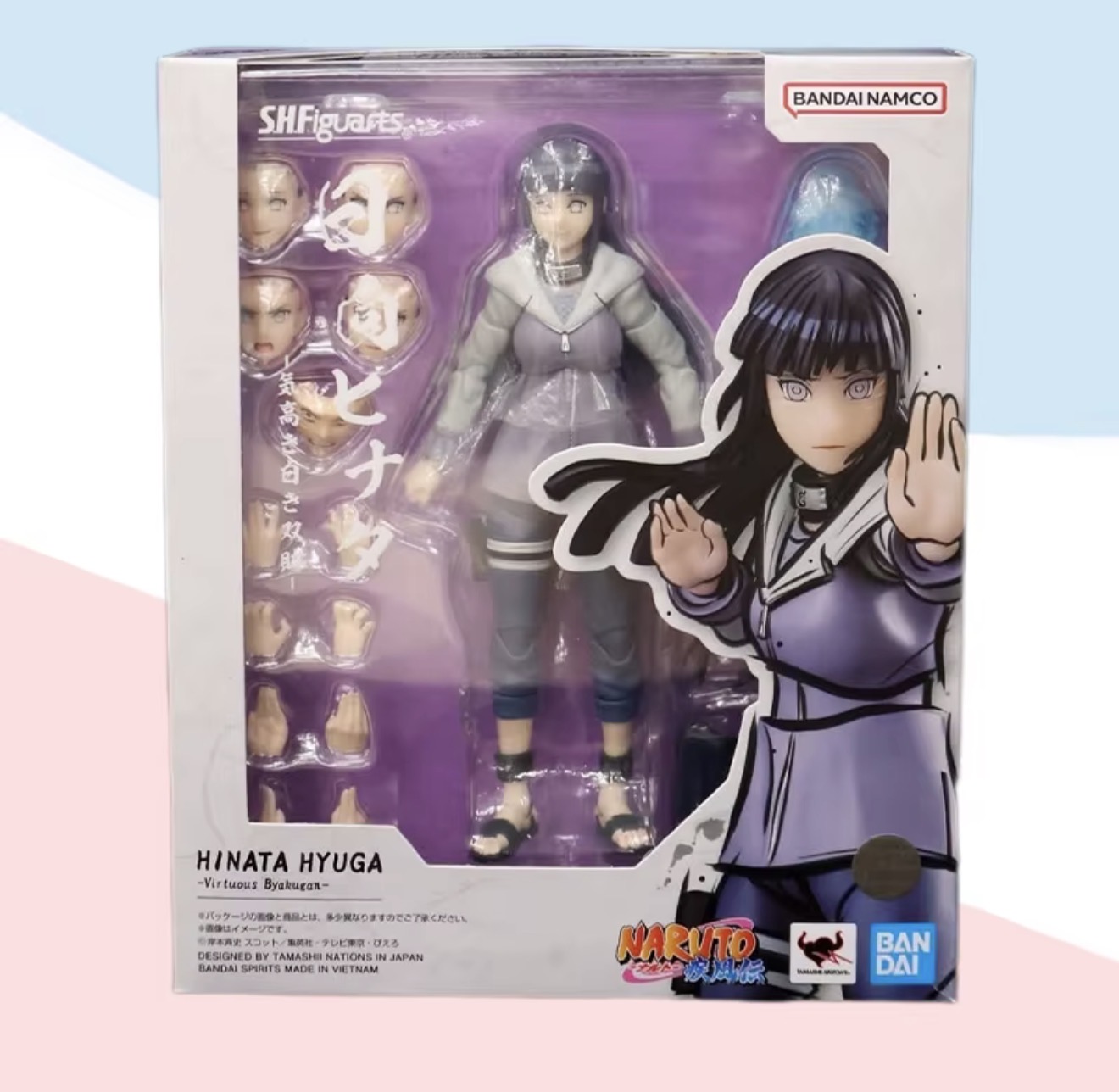 S.H.Figuarts Hinata Hyuga -Virtuous Byakugan- action figure from the Narutoseries.It is a detailed, adult collectible item from Tamashii Nations, part of the S.H.Figuarts line. The figure measures approximately 13-14 cm (about 5.1-5.5 inches) tall. It comes with several accessories, including four interchangeable face plates (such as a smile and a Byakugan expression), multiple hand parts, effect parts for her "Gentle Step Twin Lion Fists" ninjutsu, and a fluttering hair part. It is an officially licensed product from the Narutomanga/anime series. The manufacturer is Bandai Spirits, and the product is made in Vietnam.