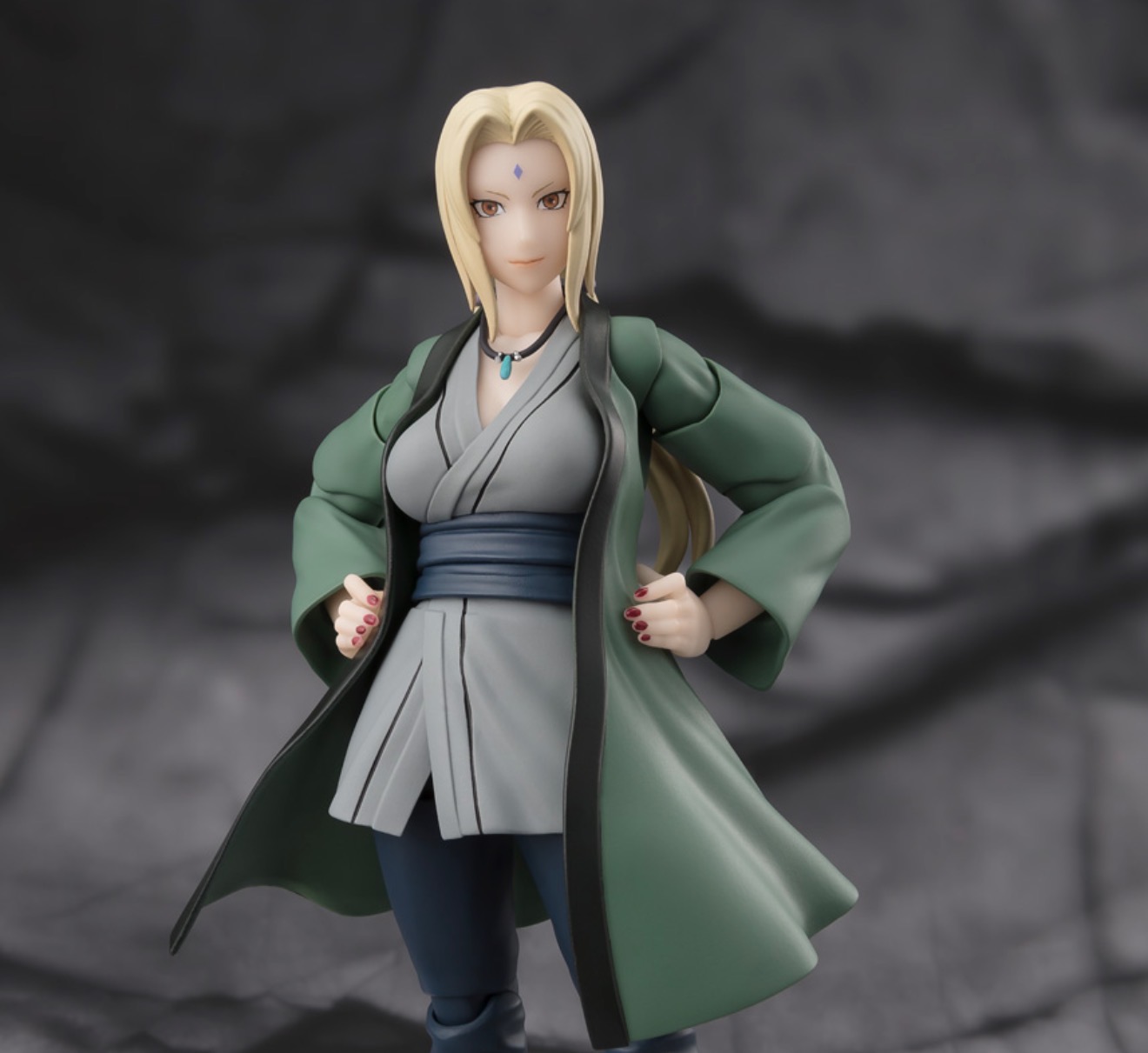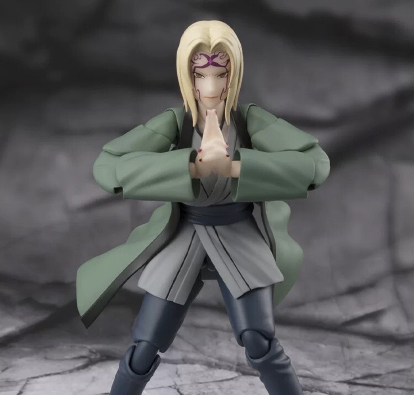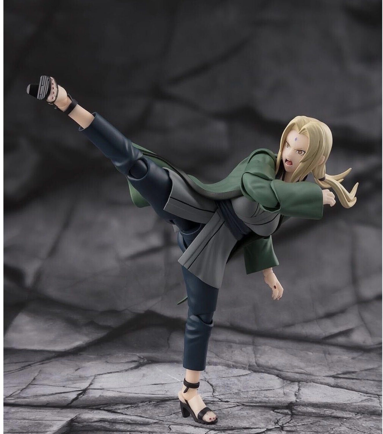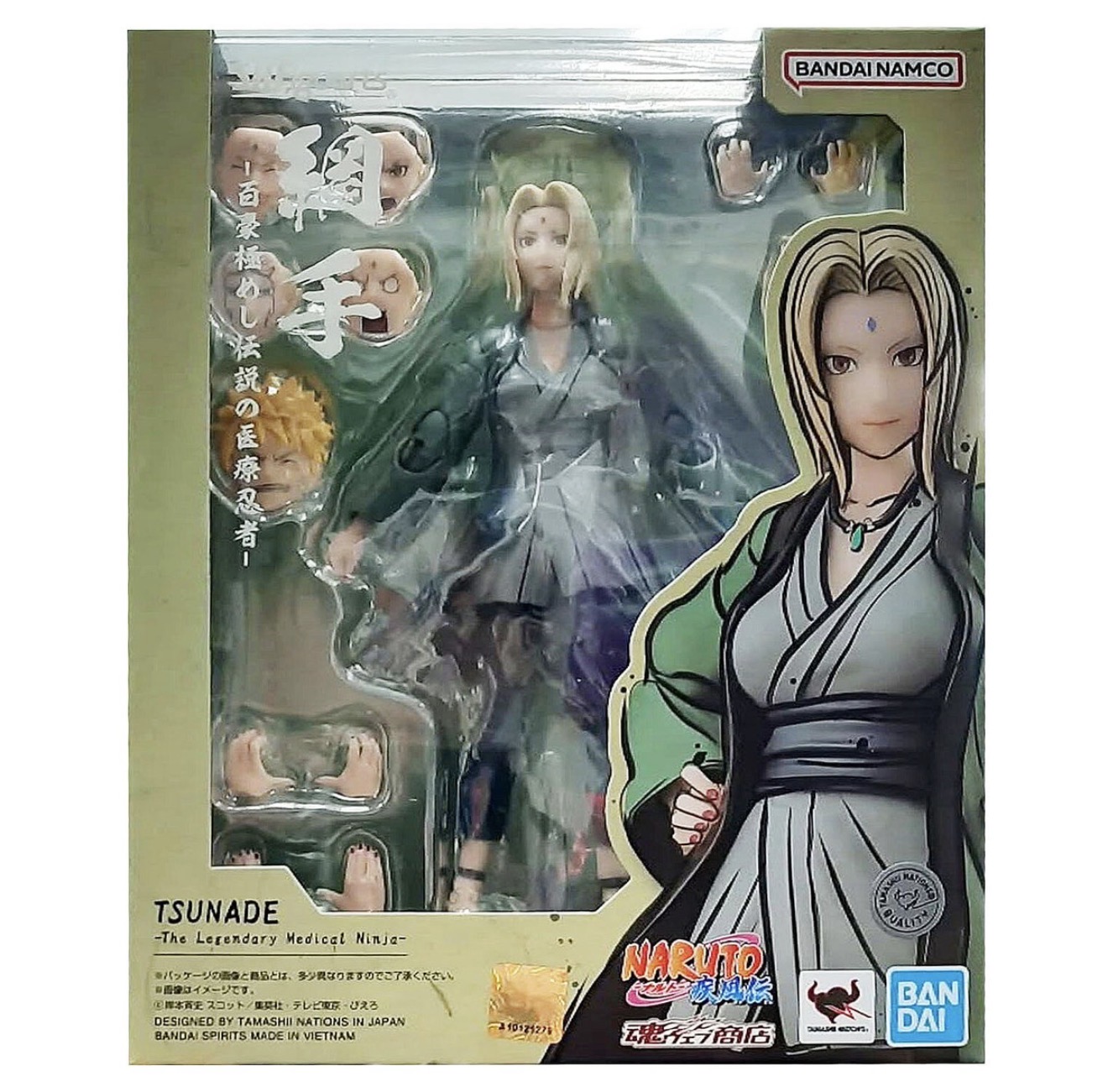 Manufacturer: Bandai Tamashii Nations Character: Tsunade from Naruto ShippudenSize: Approximately 14 cm (about 6 inches) tall Included Accessories: The figure typically comes with three sets of interchangeable hands, four face plates, and a necklace. Additional Feature: The package also includes an alternative head part for the S.H. Figuarts Naruto Uzumaki figure (sold separately).