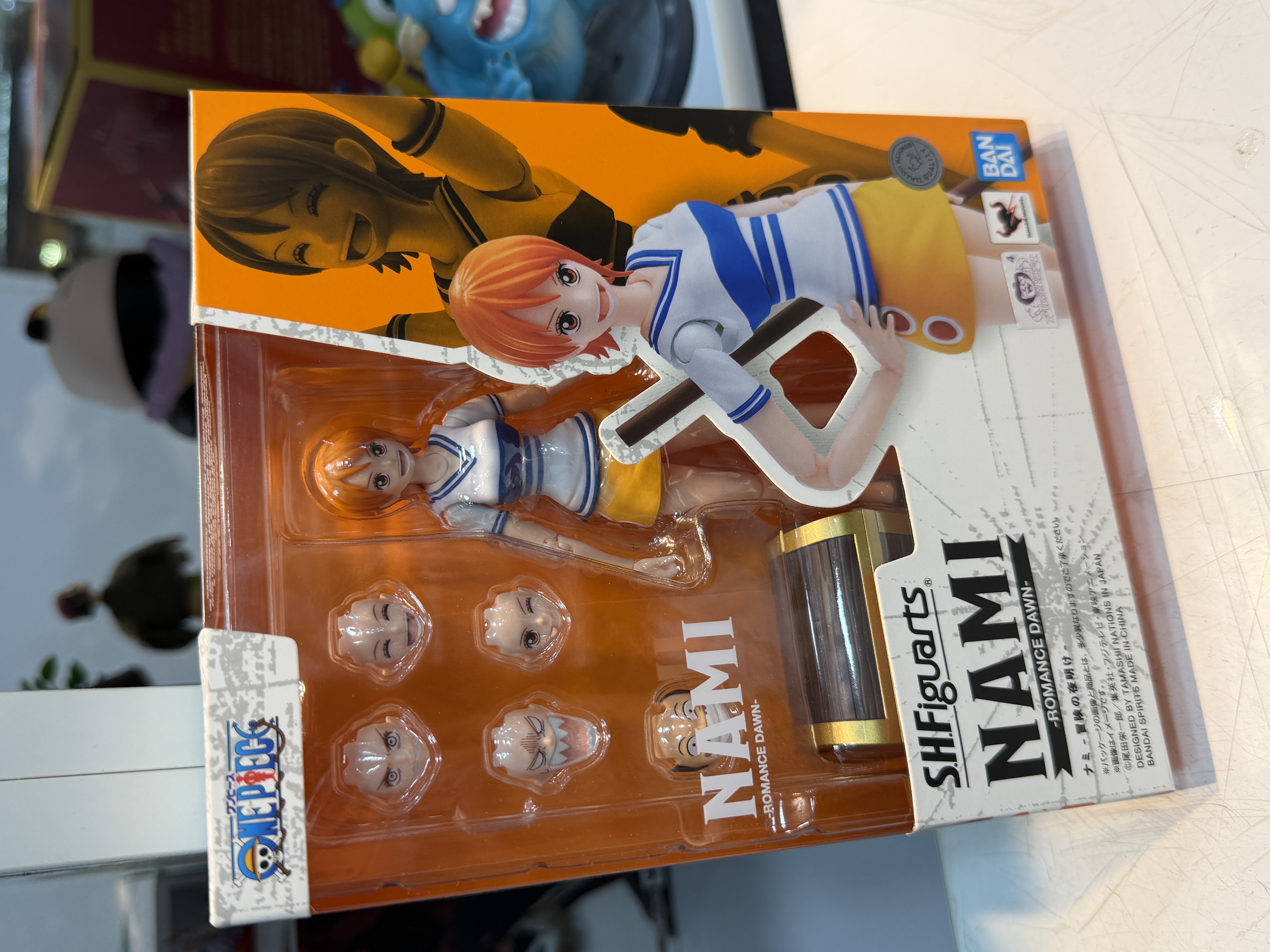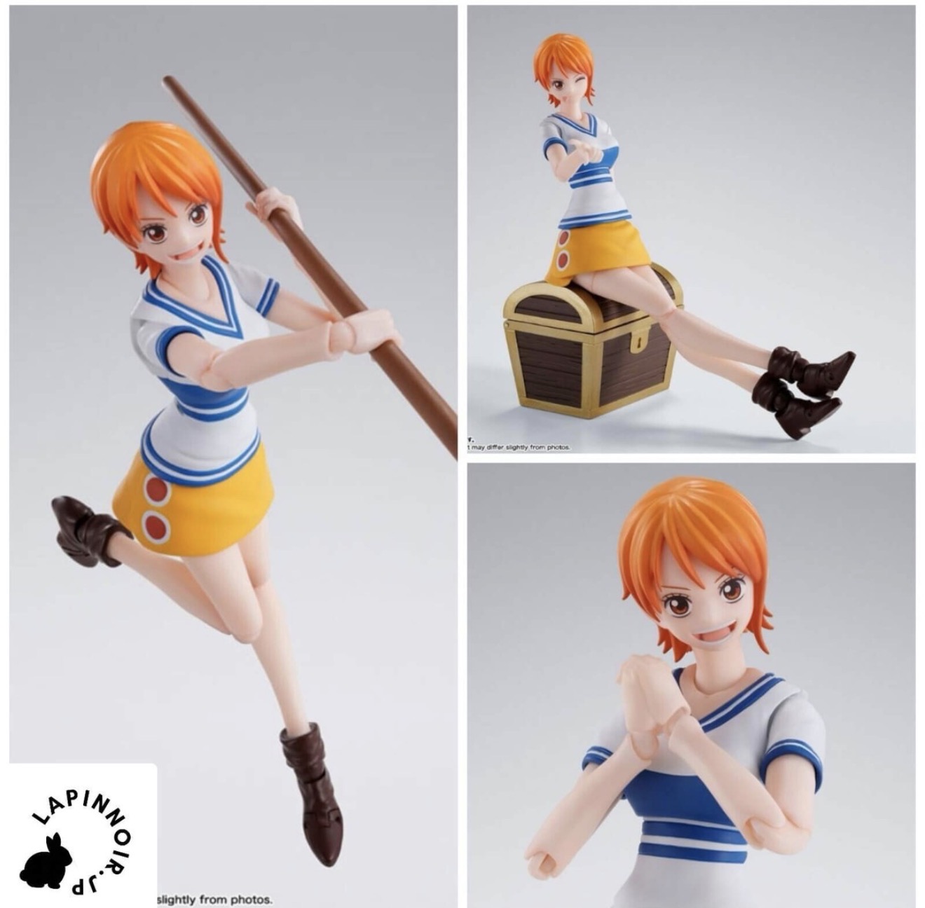 S.H.Figuarts Nami -Romance Dawn- action figure by Bandai, based on the One Pieceanime series. This figure is a completely new sculpt designed to allow for dynamic posing, with an overwhelming range of motion in the shoulder joints and abdomen. The set includes the main body, multiple optional hands, four optional expressions, her weapon (bo staff), and a treasure chest. It also comes with an optional expression part for the separately sold S.H.Figuarts Monkey D. Luffy -Romance Dawn- figure. The skirt is made of a soft material to prevent it from hindering leg articulation during posing.