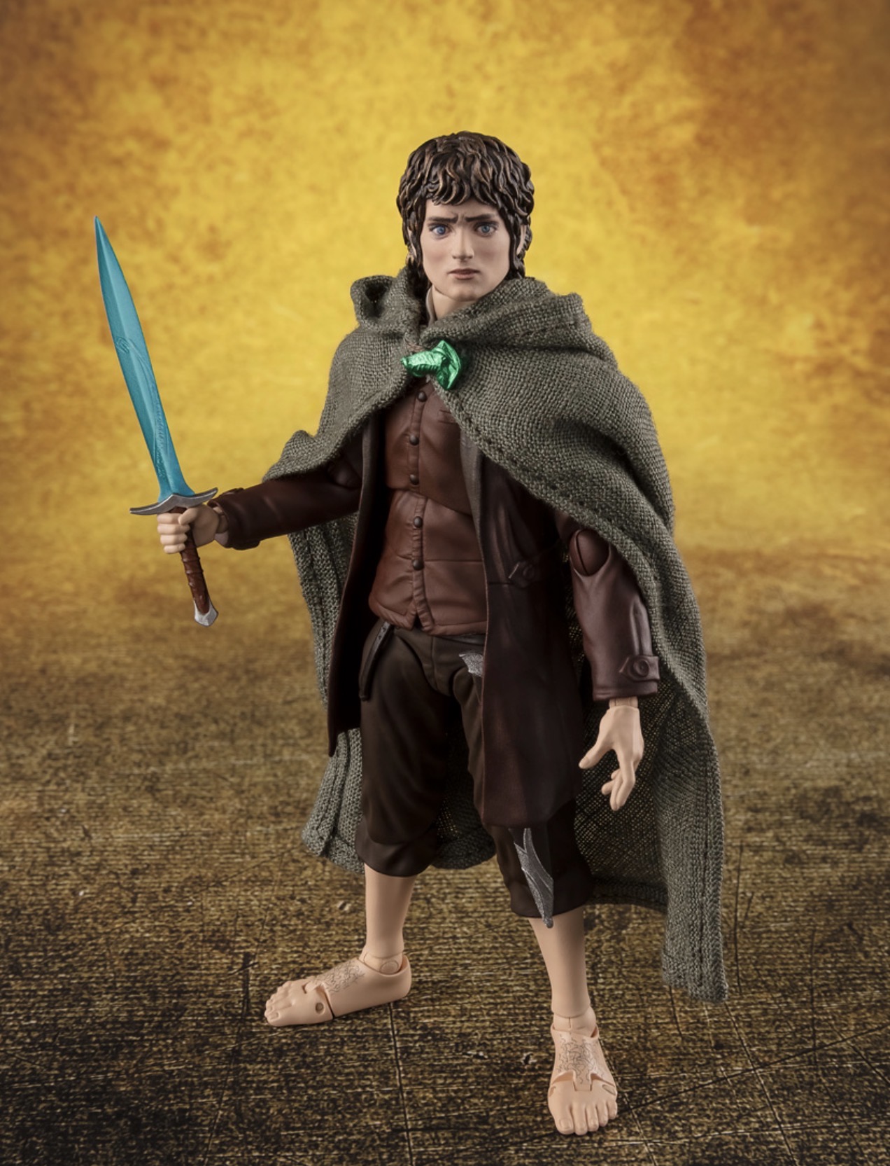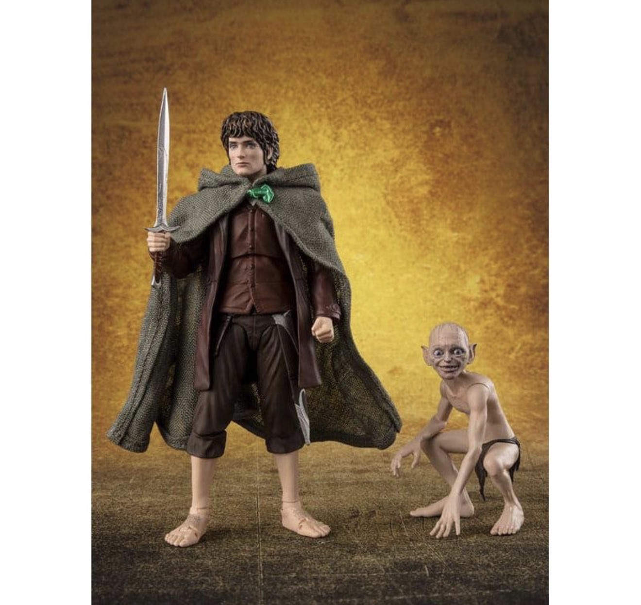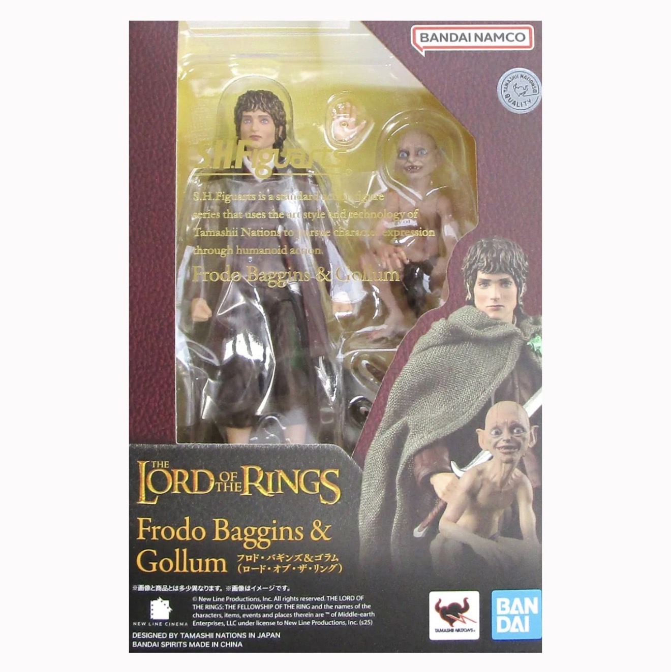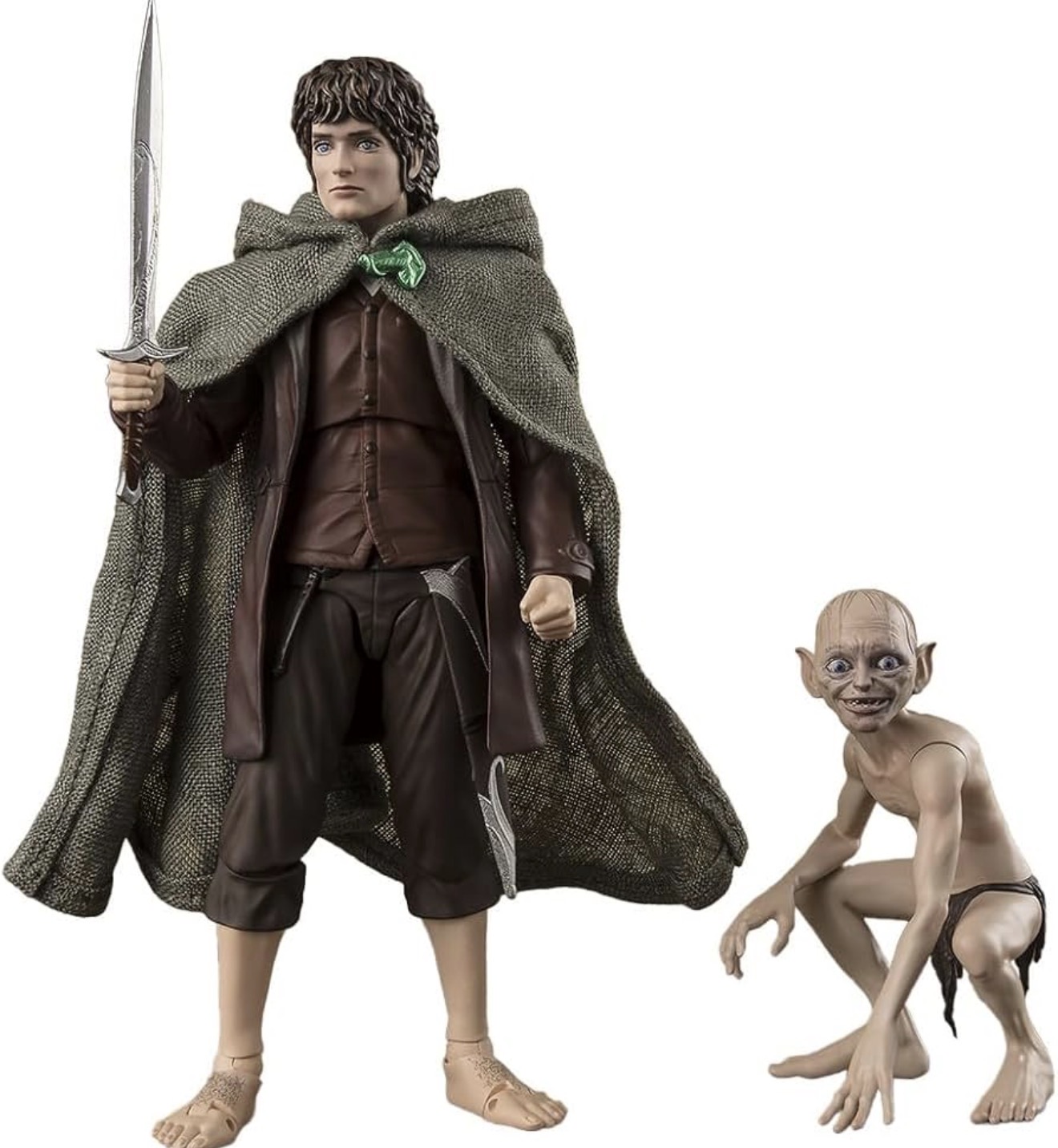S.H.Figuarts Frodo Baggins & Gollum action figure set from the The Lord of the Rings franchise. This officially licensed product is manufactured by Bandai Spirits under the Tamashii Nations brand. The set includes the Frodo figure, interchangeable hand parts (including one with the One Ring), a set of Sting (sword), a poseable cloth cloak with a wire, and a Gollum figure. The figures are made of PVC, ABS, and fabric materials.