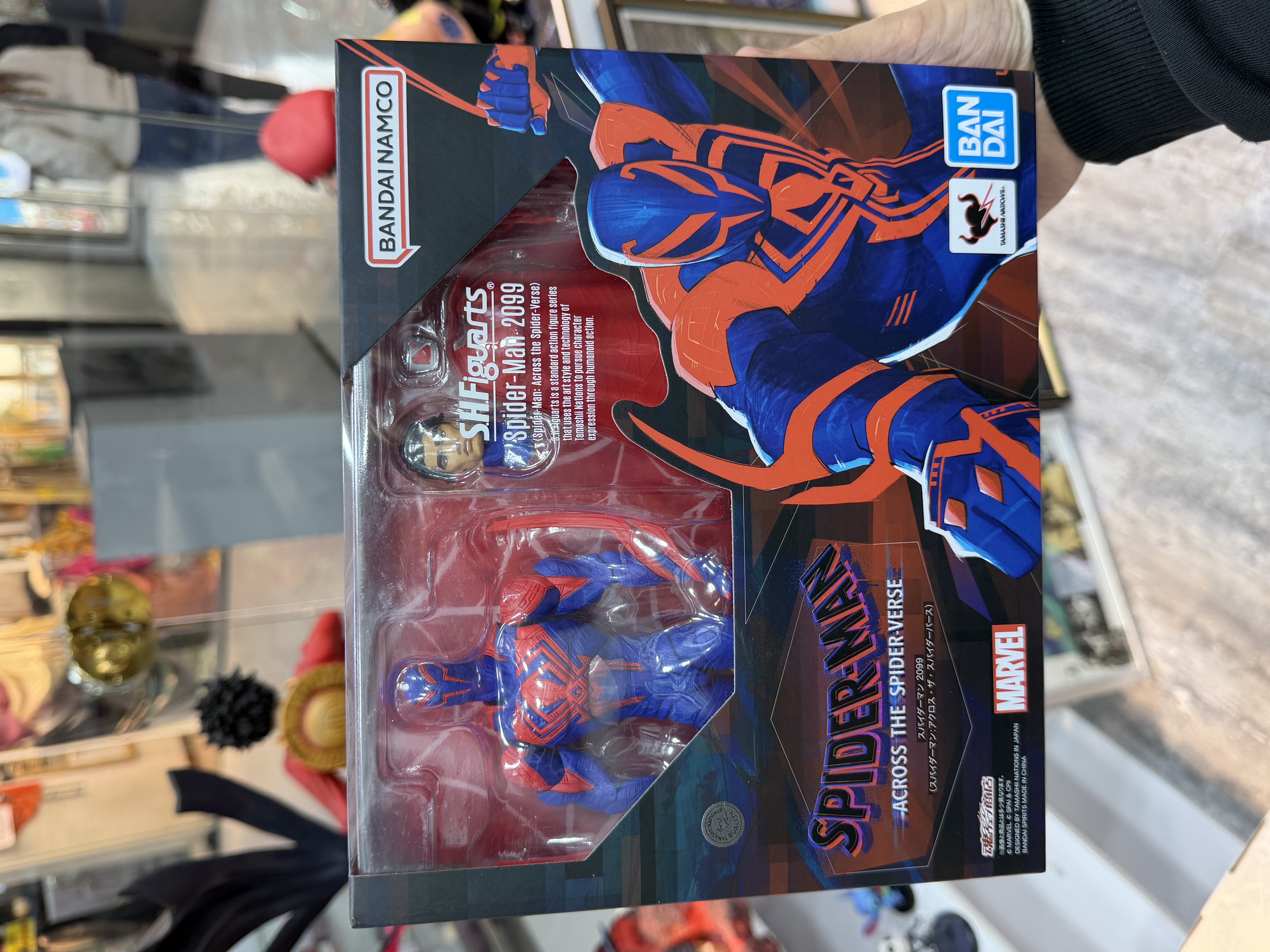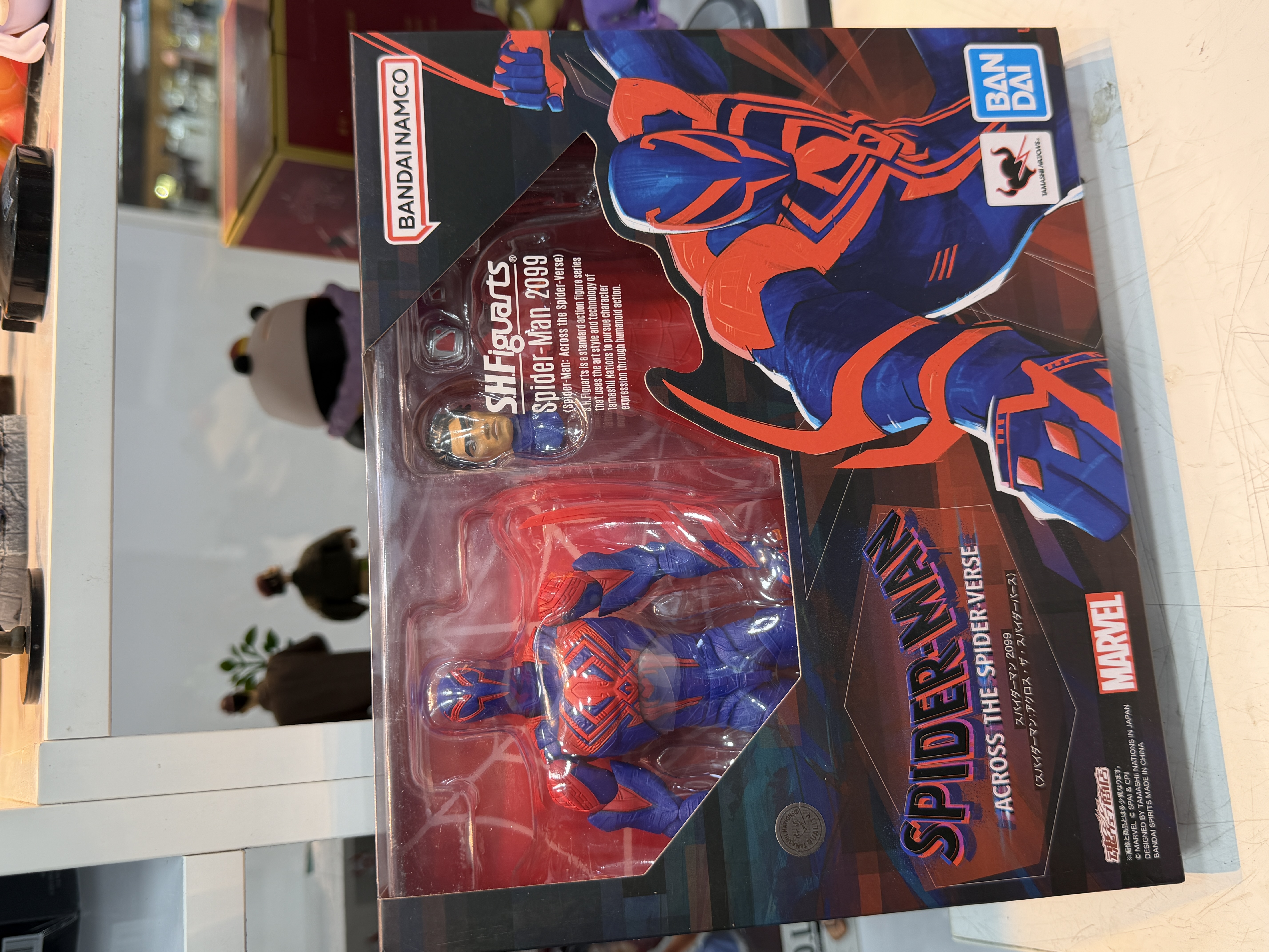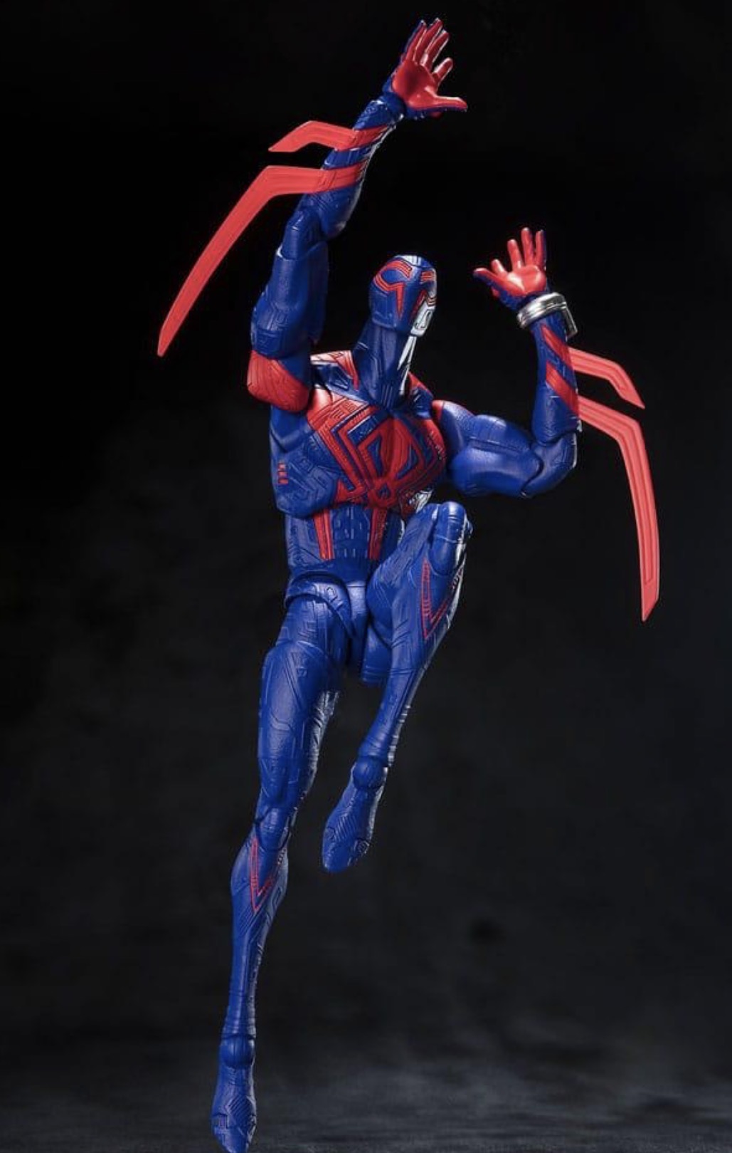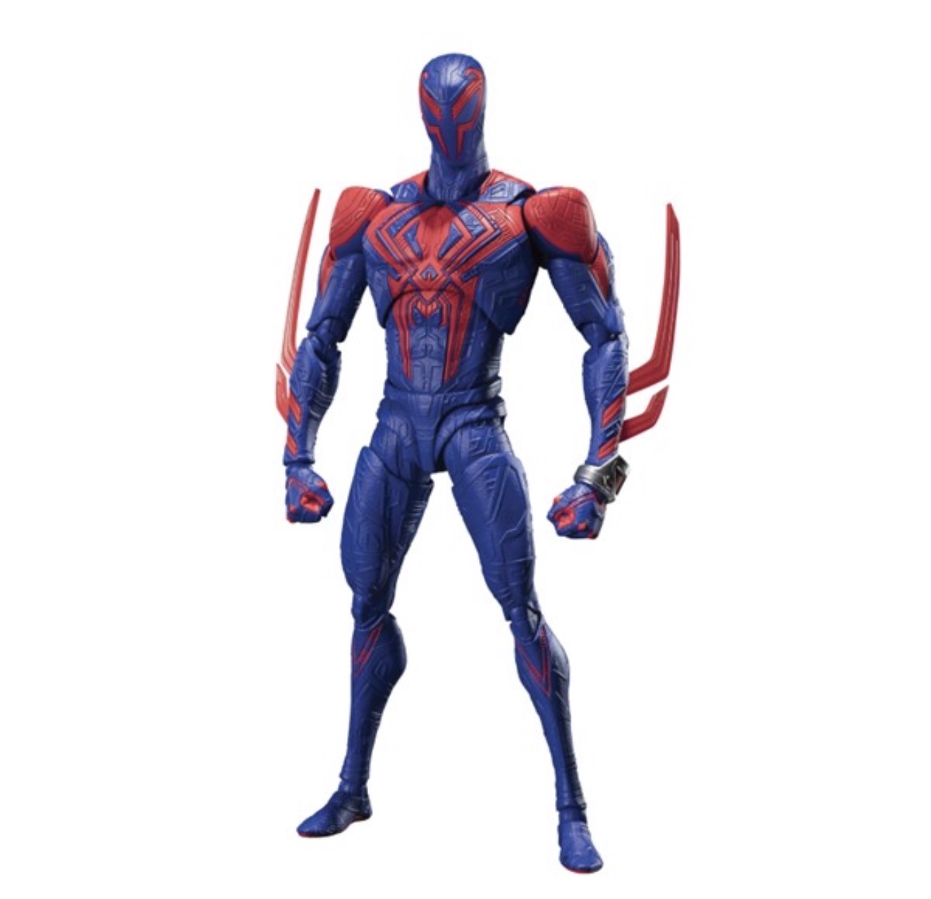 S.H.Figuarts Spider-Man 2099 action figure from the movie Spider-Man: Across the Spider-Verse. This collectible figure is produced by Bandai Namco's Tamashii Nations. It is a fully articulated action figure that comes with accessories, including an optional head, hands, cape, and spiderweb effects. The figure is crafted from durable PVC material.